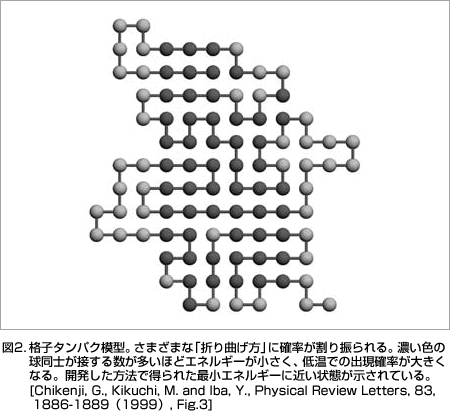 ![図3.格子タンパク模型。さまざまな「折り曲げ方」に確率が割り振られる。濃い色の球同士が接する数が多いほどエネルギーが小さく、低温での出現確率が大きくなる。開発した方法で得られた最小エネルギーに近い状態が示されている。[Chikenji, G., Kikuchi, M. and Iba, Y., Physical Review Letters, 83, 1886-1889(1999), Fig.3]](../img/visit/111-2/diagram_03.gif)