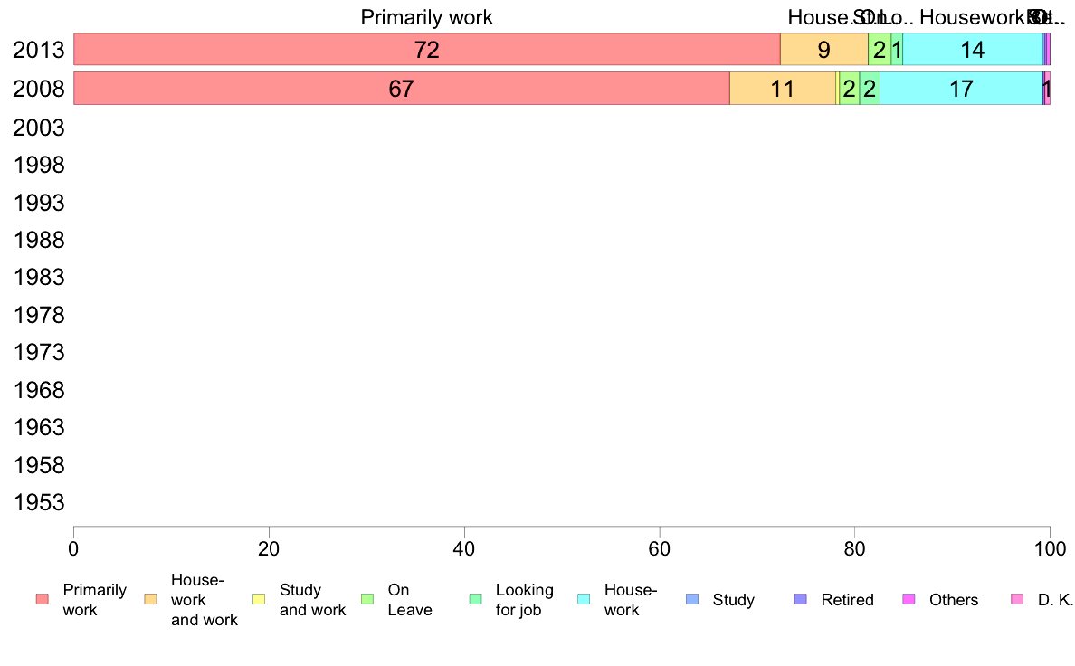 | 1 | (Have had some sort of job) I was primarily working | | 2 | ( '' ) I did some work but mostly housework and other non-paying activities | | 3 | ( '' ) I did some work while attending school | | 4 | (Have never had a job) I was on a leave | | 5 | ( '' ) I was looking for a job | | 6 | ( '' ) I was doing housework | | 7 | ( '' ) I was attending school | | 8 | ( '' ) I'm retired or living on a pension | | 9 | Other(Specify) | 10 D.K. |