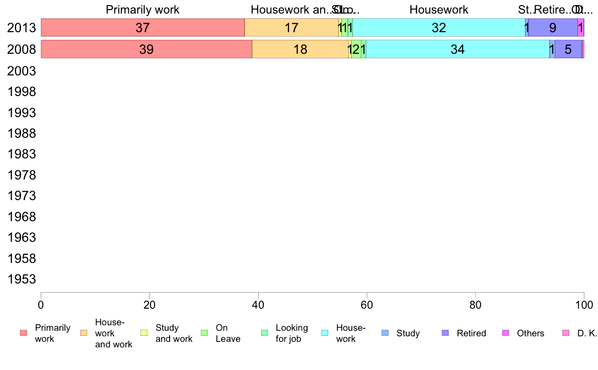 | 1 | (Have had some sort of job) I was primarily working | | 2 | ( '' ) I did some work but mostly housework and other non-paying activities | | 3 | ( '' ) I did some work while attending school | | 4 | (Have never had a job) I was on a leave | | 5 | ( '' ) I was looking for a job | | 6 | ( '' ) I was doing housework | | 7 | ( '' ) I was attending school | | 8 | ( '' ) I'm retired or living on a pension | | 9 | Other(Specify) | 10 D.K. |