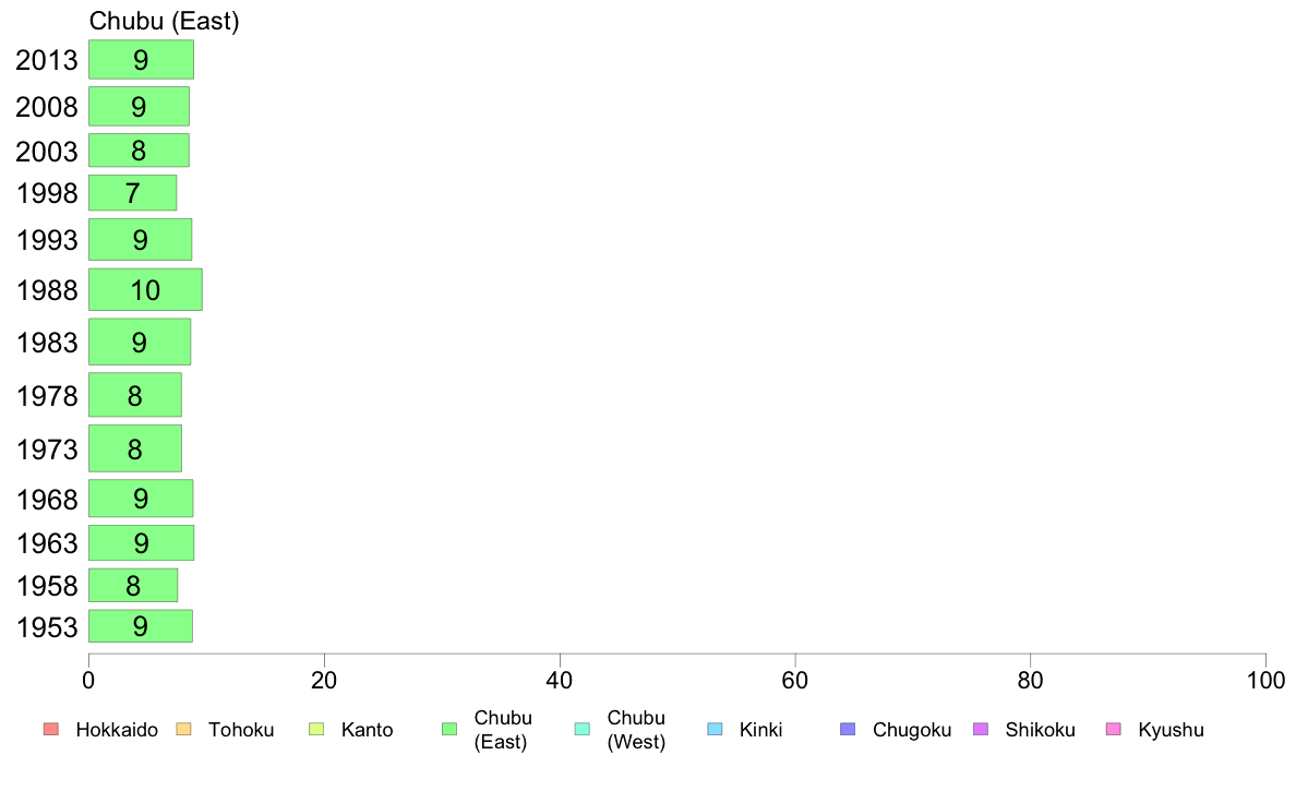 | 1 | Hokkaido : Hokkaido | | 2 | Tohoku : Aomori, Iwate, Miyagi, Akita, Yamagata, Fukushima | | 3 | Kanto : Ibaraki, Tochigi, Gumma, Saitama, Chiba, Tokyo, Kanagawa | | 4 | Chubu (East) : Niigata, Yamanashi, Nagano, Shizuoka | | 5 | Chubu (West) : Toyama, Ishikawa, Fukui, Gifu, Aichi | | 6 | Kinki : Mie, Shiga, Kyoto, Osaka, Hyogo, Nara, Wakayama | | 7 | Chugoku : Tottori, Shimane, Okayama, Hiroshima, Yamaguchi | | 8 | Shikoku : Kagawa, Ehime, Tokushima, Kochi | | 9 | Kyushu : Fukuoka, Saga, Nagasaki, Oita, Kumamoto, Miyazaki, Kagoshima, Okinawa |
