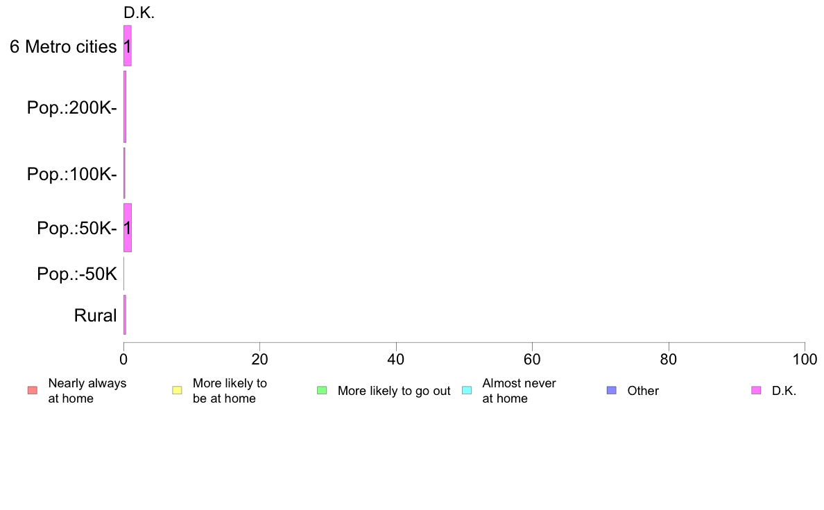 | 1 | (A) | I'm almost always at home | | 2 | (B) | More likely to be at home | | 3 | (C) | More likely to go out | | 4 | (D) | Almost never at home | | 5 | | Other(Specify) | | 6 | | D.K. |