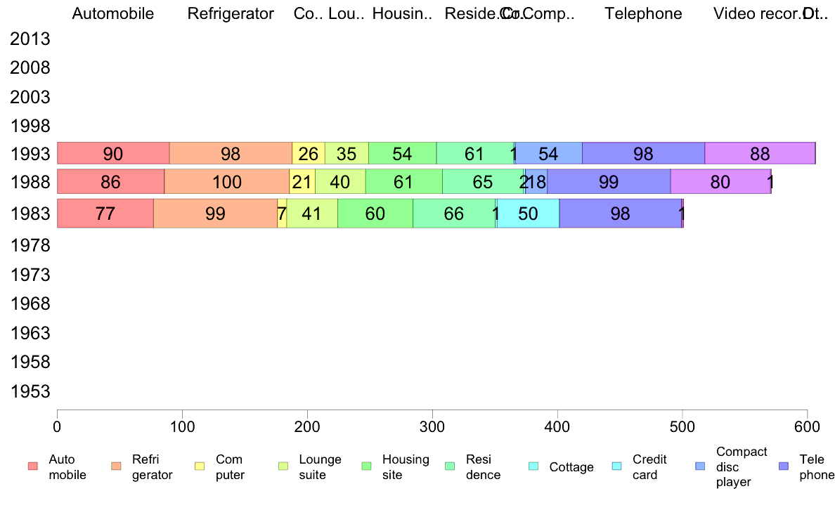 | 1 | Automobile (non-commercial) | | 2 | Refrigerator | | 3 | Computer (or microcomputer) | | 4 | Lounge suite | | 5 | Housing site | | 6 | Residence (including a condominium) | | 7 | Cottage (including co-owned cottages) | | 8 | Credit card | | 9 | Compact disc player | | 10 | Telephone | | 11 | Video recorder | | 12 | Other(Specify) | 13 D.K. |