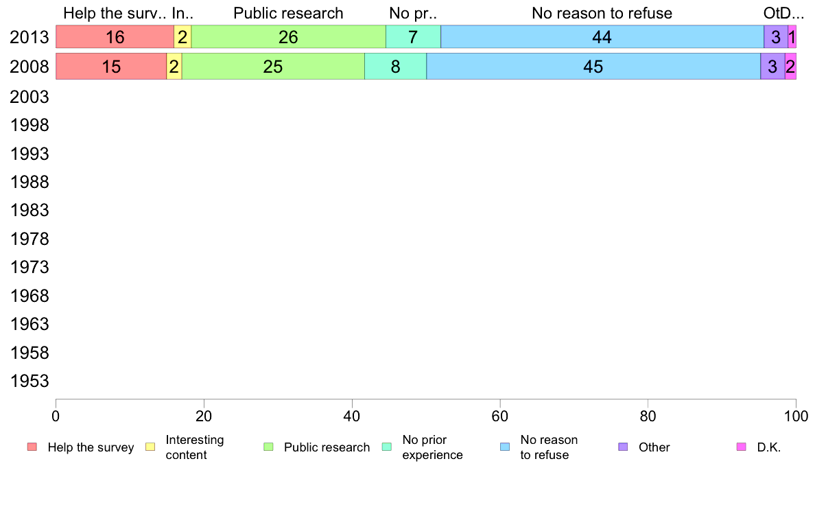 | | Ques. No. | Help the survey | Interesting content | Public research | No prior experience | No reason to refuse | Other | D.K. | Total |