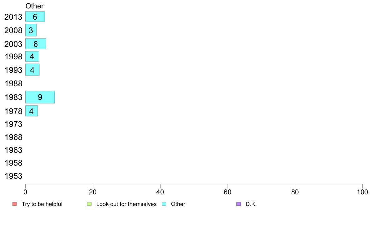 | 1 | Try to be helpful | | 2 | Look out for themselves | | 3 | Other(Specify) | 4 D.K. |