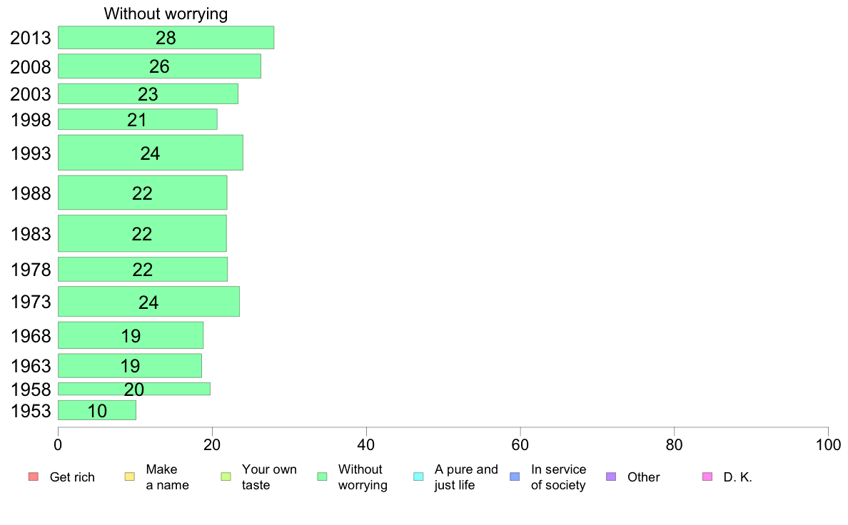 | 1 | Work hard and get rich | | 2 | Study earnestly and make a name for yourself | | 3 | Don't think about money or fame; just live a life that suits your own taste | | 4 | Live each day as it comes, cheerfully and without worrying | | 5 | Resist all evils in the world and live a pure and just life | | 6 | Never think of yourself, give everything in service of society | | 7 | Other(Specify) | 8 D.K. |