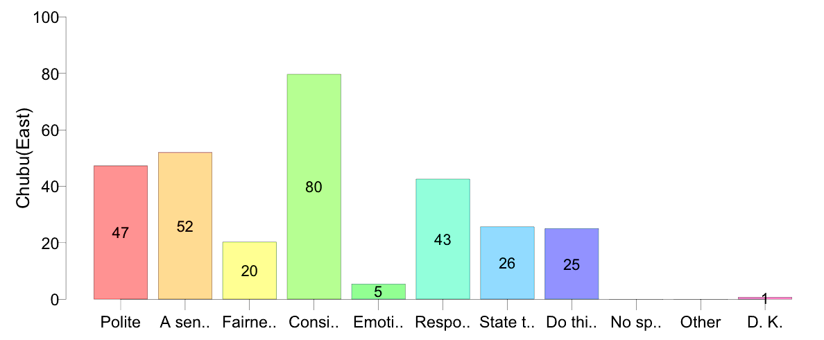 | 6 Metro cities | 48 | 52 | 15 | 77 | 8 | 42 | 21 | 31 | - | 2 | - | 296 | ( 195) | | Pop.:200K- | 47 | 55 | 16 | 74 | 8 | 46 | 22 | 24 | 0 | 1 | 1 | 294 | ( 612) | | Pop.:100K- | 44 | 67 | 15 | 75 | 5 | 45 | 22 | 25 | 0 | - | - | 298 | ( 254) | | Pop.:50K- | 47 | 55 | 11 | 73 | 6 | 48 | 28 | 22 | 1 | 3 | 0 | 294 | ( 265) | | Pop.:-50K | 48 | 58 | 13 | 67 | 6 | 39 | 28 | 25 | - | 4 | 2 | 290 | ( 126) | | Rural | 47 | 57 | 14 | 70 | 5 | 48 | 33 | 21 | - | 1 | 0 | 296 | ( 277) | | Hokkaido | 48 | 54 | 12 | 74 | 10 | 52 | 23 | 24 | 1 | - | - | 298 | ( 91) | | Tohoku | 48 | 58 | 11 | 66 | 7 | 45 | 30 | 23 | 2 | 2 | - | 292 | ( 149) | | Kanto | 45 | 58 | 14 | 73 | 8 | 44 | 26 | 27 | - | 1 | 0 | 296 | ( 489) | | Chubu(East) | 47 | 52 | 20 | 80 | 5 | 43 | 26 | 25 | - | - | 1 | 299 | ( 148) | | Chubu(West) | 51 | 59 | 14 | 71 | 7 | 49 | 20 | 27 | - | 1 | - | 299 | ( 177) | | Kinki | 46 | 56 | 15 | 76 | 6 | 48 | 25 | 18 | - | 3 | 1 | 294 | ( 292) | | Chugoku | 53 | 58 | 13 | 71 | 4 | 56 | 18 | 24 | 1 | - | - | 298 | ( 107) | | Shikoku | 42 | 61 | 14 | 81 | 3 | 41 | 25 | 32 | - | - | - | 299 | ( 59) | | Kyushu | 46 | 58 | 15 | 71 | 7 | 40 | 30 | 21 | - | 3 | 1 | 292 | ( 217) | | Grades 1-9 | 54 | 59 | 13 | 62 | 4 | 48 | 28 | 19 | 1 | 2 | 1 | 291 | ( 316) | | Grades 10-12 | 50 | 59 | 11 | 75 | 5 | 47 | 25 | 21 | 0 | 2 | 0 | 295 | ( 836) | | College/University | 38 | 53 | 20 | 78 | 10 | 43 | 23 | 31 | - | 1 | 0 | 297 | ( 574) |