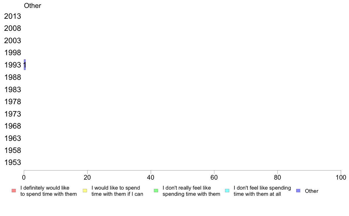 | 1 | I definitely would like to spend time with them | | 2 | I would like to spend time with them if I can | | 3 | I don't really feel like spending time with them | | 4 | I don't feel like spending time with them at all | | 5 | Other(Specify) | 6 D.K. |