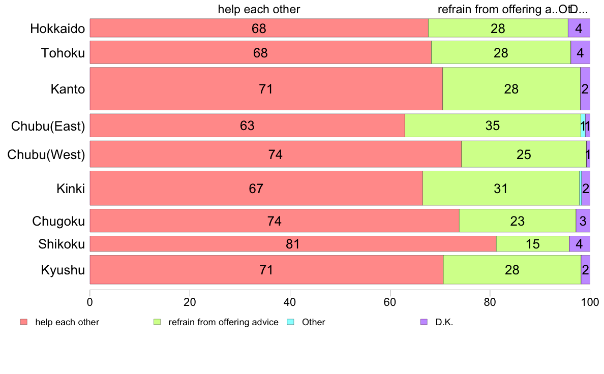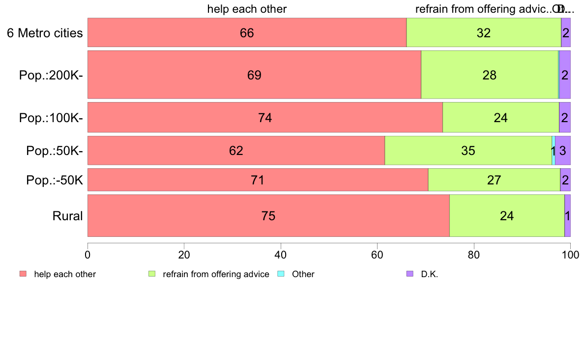 | 1 | (A) | Everybody is likely to overlook his own faults, so we should help each other by pointing them out | | 2 | (B) | One should just look after one's own affairs properly, and refrain from offering advice to others | | 3 | | Other(Specify) | | 4 | | D.K. |