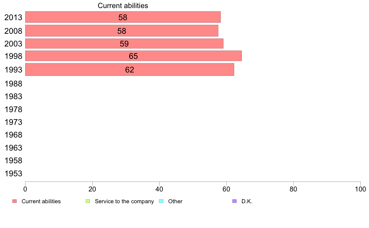 When a company decides on salaries and wages, do you think that they should attach greatest importance to a person's current abilities in making the decision? Or do you think the person's service to the company from past to present should be stressed in the decision?