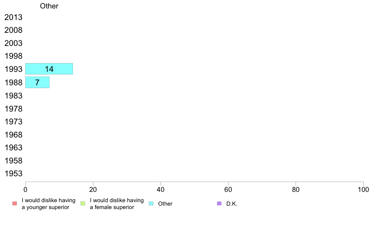 | 1 | I would dislike having a younger superior | | 2 | I would dislike having a female superior | | 3 | Other(Specify) | 4 D.K. |