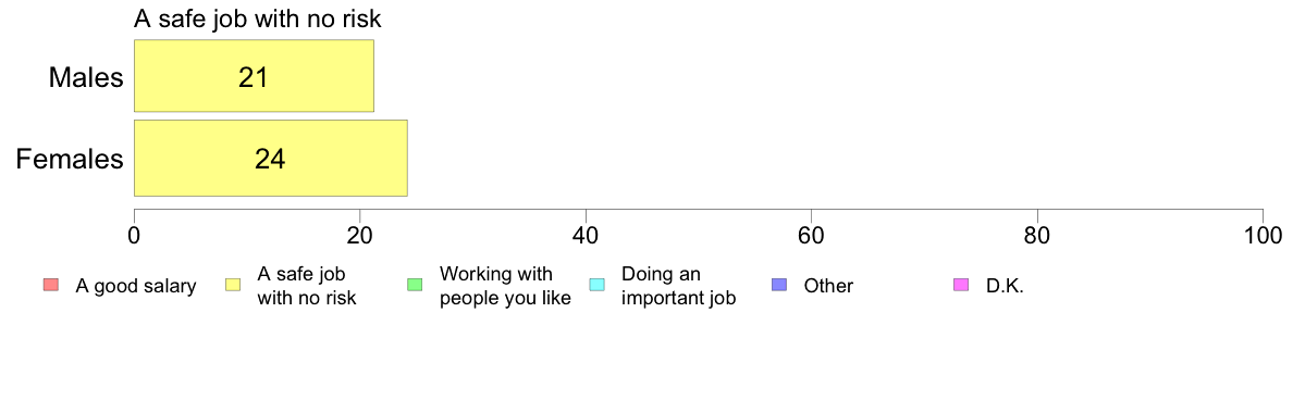 | 1 | (A) | A good salary | | 2 | (B) | A safe job with no risk of closing down or unemployment | | 3 | (C) | Working with people you like | | 4 | (D) | Doing an important job which gives you a feeling of accomplishment | | 5 | | Other(Specify) | | 6 | | D.K. |