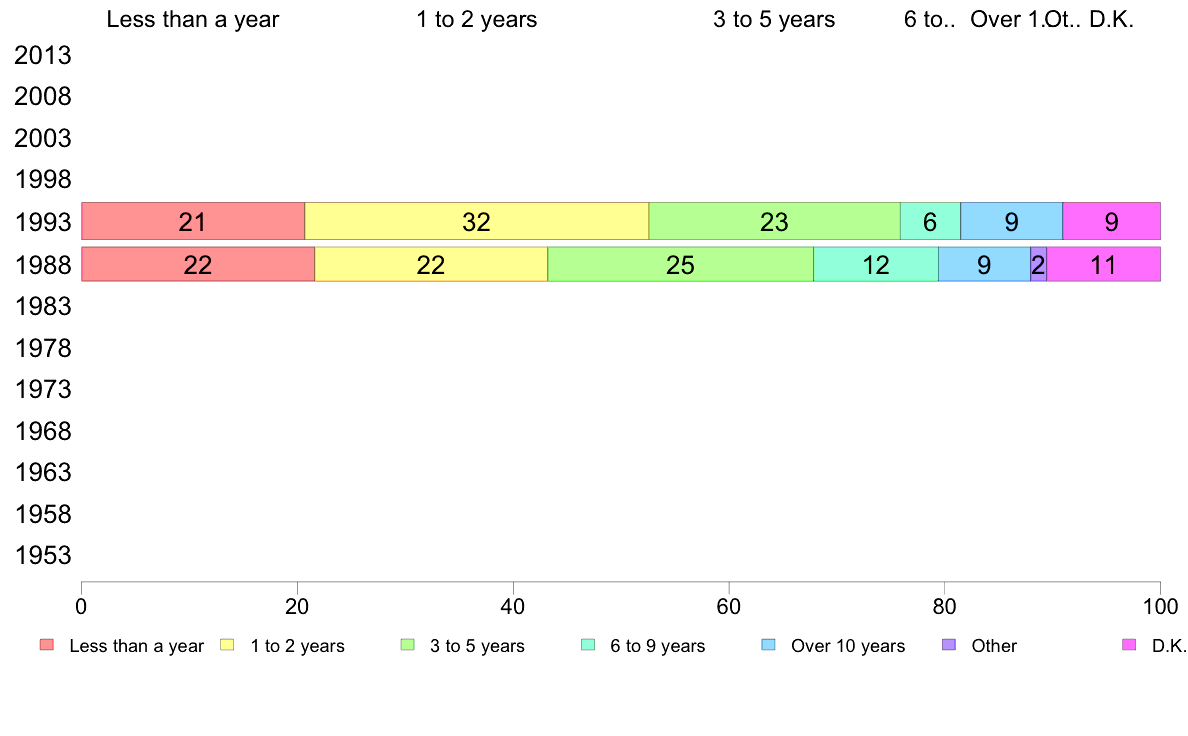 | | Ques. No. | Less than a year | 1 to 2 years | 3 to 5 years | 6 to 9 years | Over 10 years | Other | D.K. | Total |