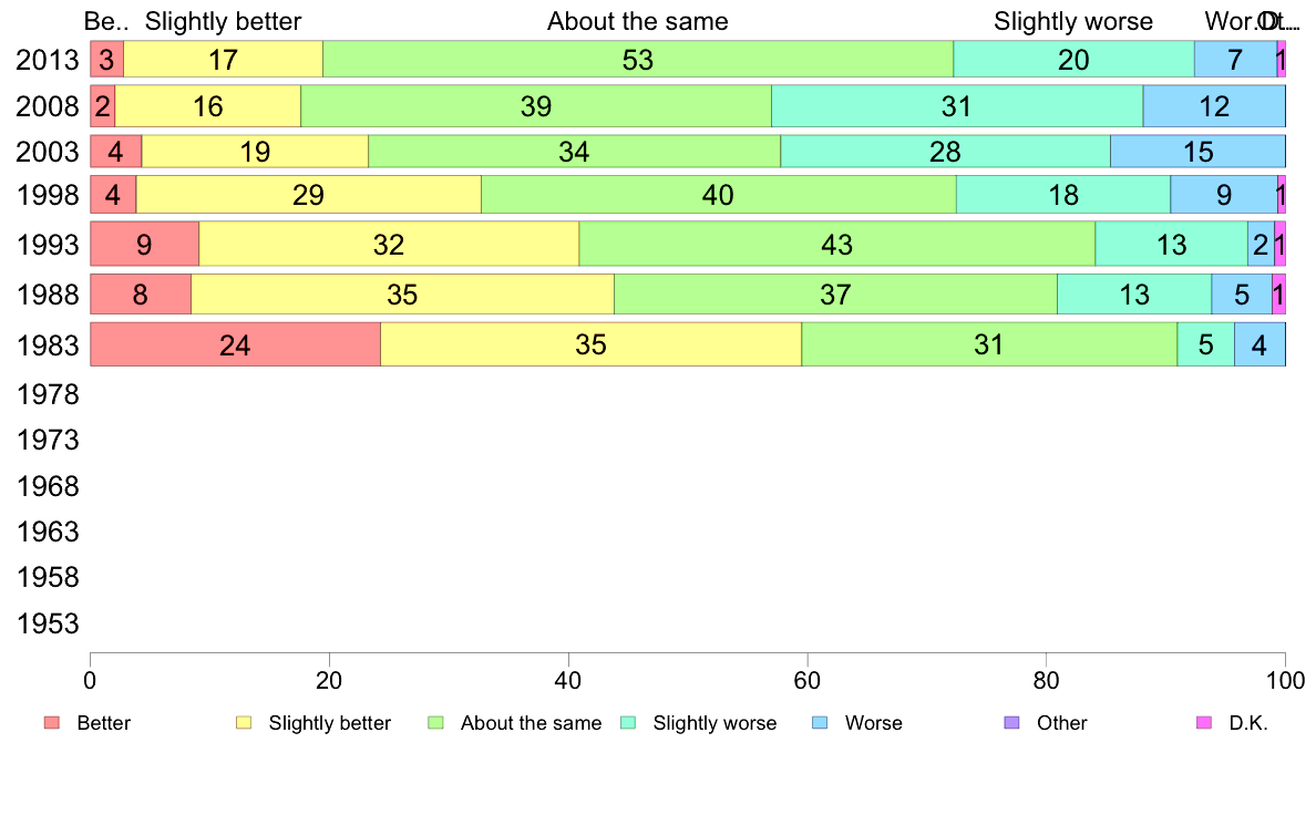 | 1 | Better | | 2 | Slightly better | | 3 | About the same | | 4 | Slightly worse | | 5 | Worse | | 6 | Other(Specify) | 7 D.K. |