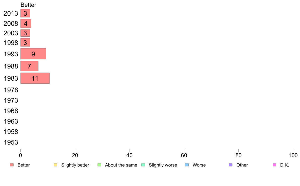 (Hand card) Compared with ten years ago do you think your standards of living is ...