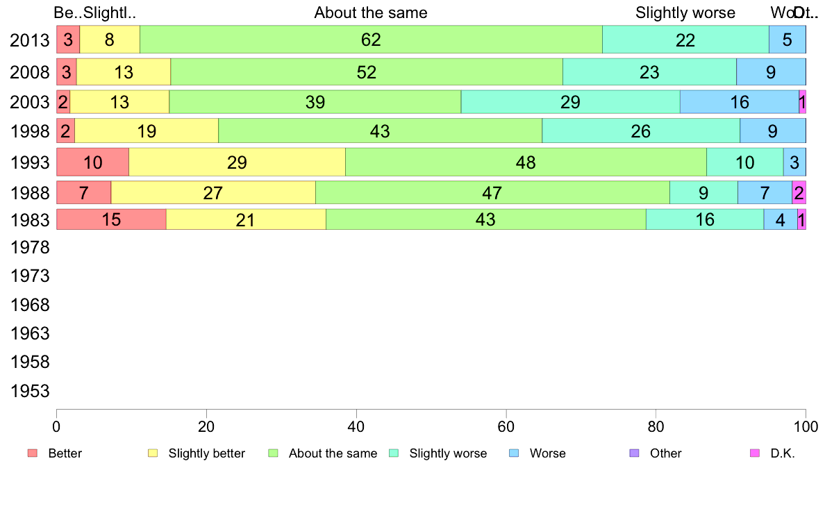 | XIII (2013) | M28 | 3 | 8 | 62 | 22 | 5 | - | - | 100 | ( 162) | | XII (2008) | M26 | 3 | 13 | 52 | 23 | 9 | - | - | 100 | ( 151) | | XI (2003) | M26 | 2 | 13 | 39 | 29 | 16 | - | 1 | 100 | ( 113) | | X (1998) | M26 | 2 | 19 | 43 | 26 | 9 | - | - | 99 | ( 125) | | IX (1993) | M24 | 10 | 29 | 48 | 10 | 3 | - | - | 100 | ( 166) | | VIII (1988) | M25 | 7 | 27 | 47 | 9 | 7 | - | 2 | 99 | ( 110) | | VII (1983) | M14a | 15 | 21 | 43 | 16 | 4 | - | 1 | 100 | ( 89) | | VI (1978) | * | | | | | | | | | | | V (1973) | * | | | | | | | | | | | IV (1968) | * | | | | | | | | | | | III (1963) | * | | | | | | | | | | | II (1958) | * | | | | | | | | | | | I (1953) | * | | | | | | | | | |