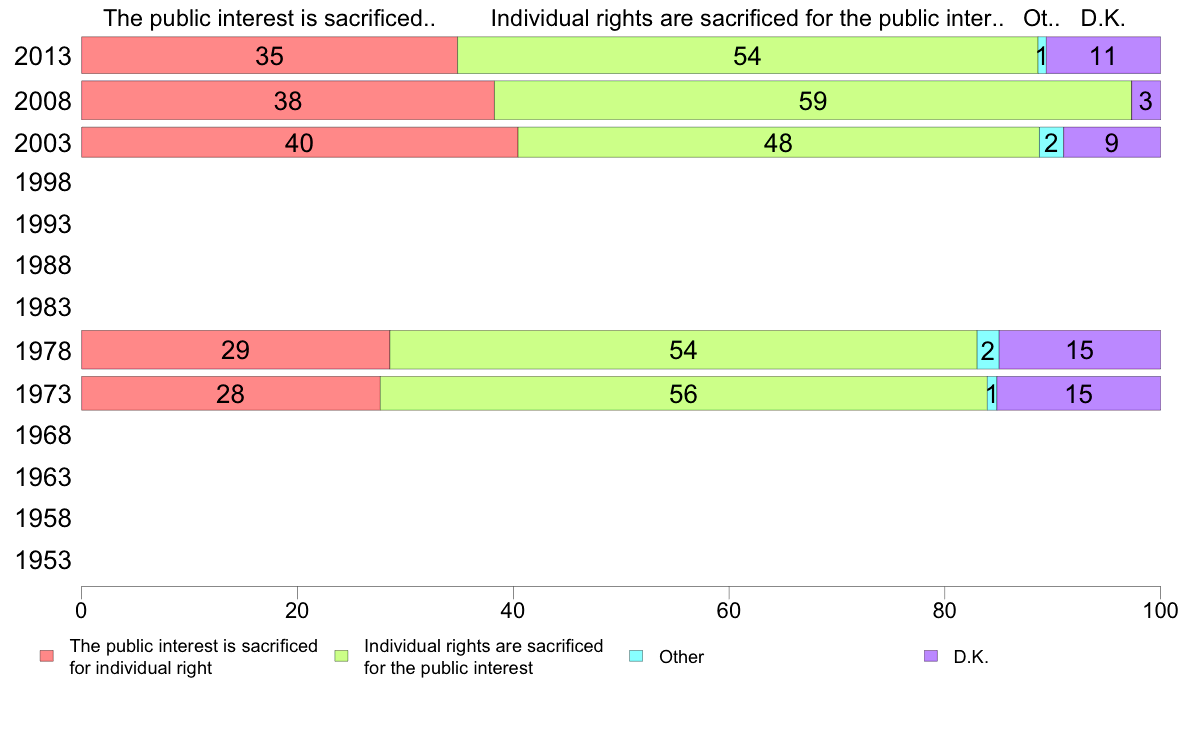 | | Ques. No. | The public interest is sacrificed for individual right | Individual rights are sacrificed for the public interest | Other | D.K. | Total |