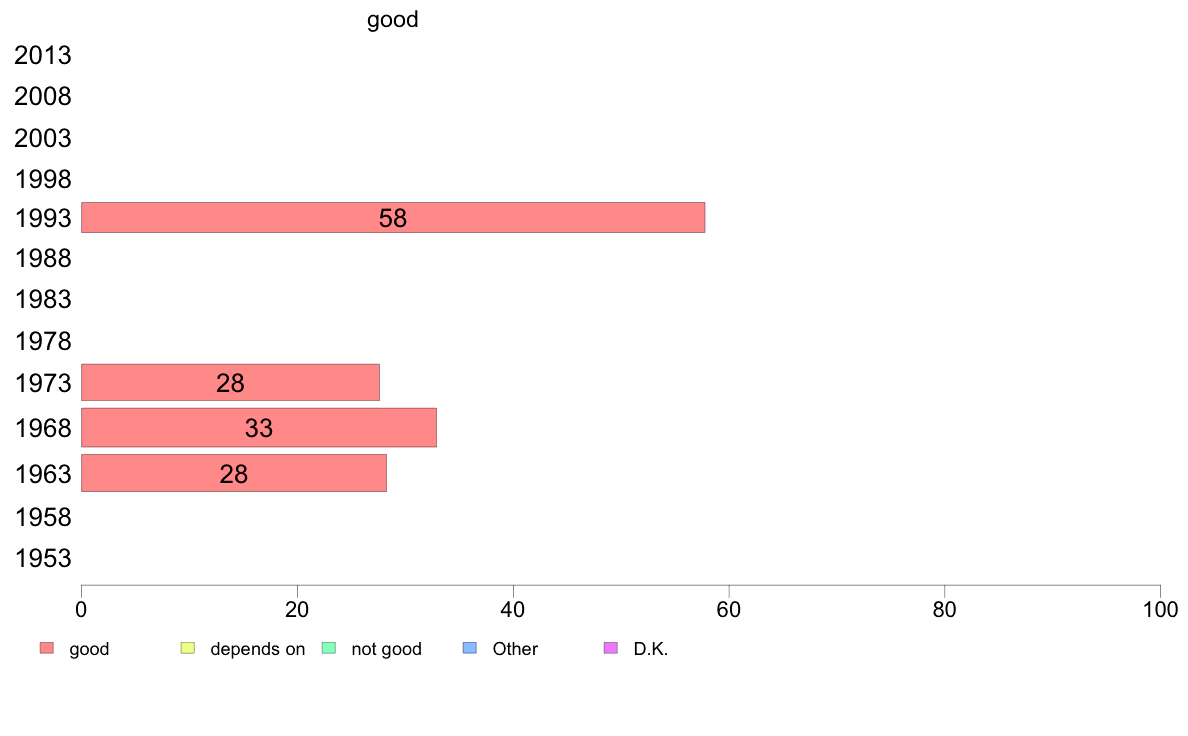 | 1 | It is good | | 2 | It depends on the time and circumstances | | 3 | It is not good | | 4 | Other(Specify) | 5 D.K. |