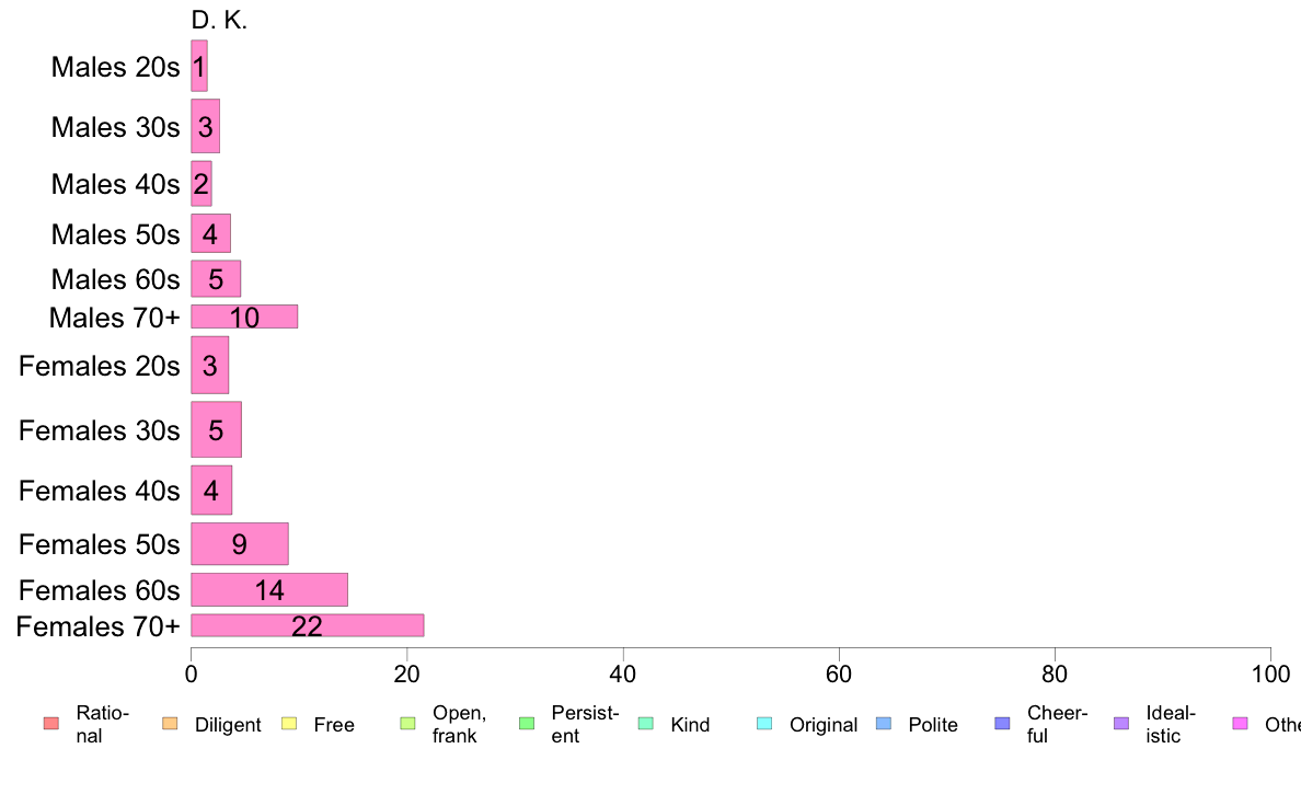 | 1 | Rational | 2 | Diligent | 3 | Free | | 4 | Open, frank | 5 | Persistent | 6 | Kind | | 7 | Original | 8 | Polite | 9 | Cheerful | | 0 | Idealistic | | X | Other(Specify) | Y D.K. |