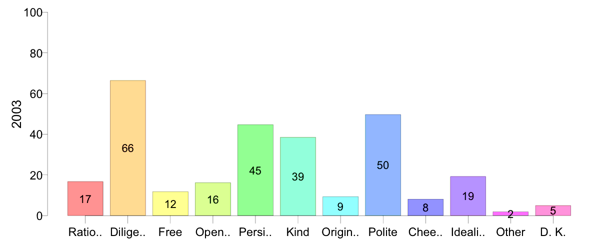 | 1 | Rational | | 2 | Diligent | | 3 | Free | | 4 | Open, frank | | 5 | Persistent | | 6 | Kind | | 7 | Original | | 8 | Polite | | 9 | Cheerful | | 10 | Idealistic | | 11 | Other(Specify) | 12 D.K. |