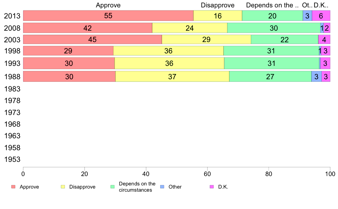 | 1 | Approve | | 2 | Disapprove | | 3 | Depends on the circumstances | | 4 | Other(Specify) | 5 D.K. |
