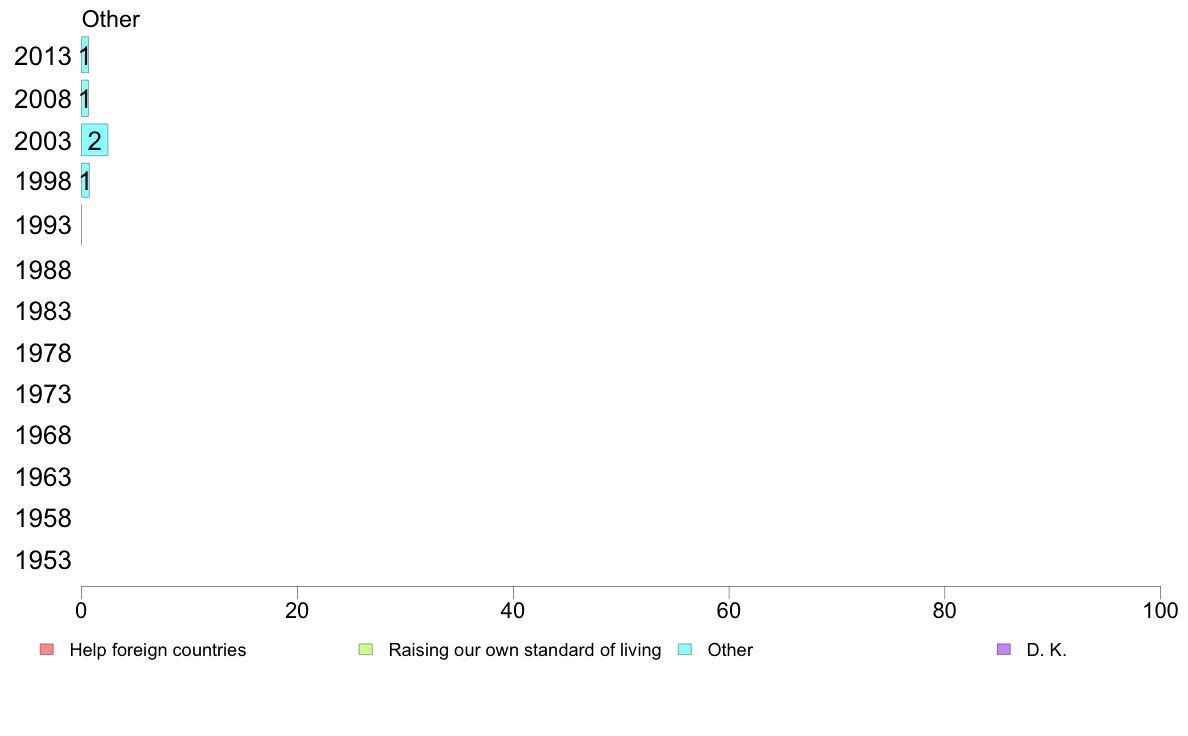| 1 | We must help foreign countries even if our own standard of living falls somewhat | | 2 | Even now we still must think first about raising our own standard of living | | 3 | Other (Specify) | 4 D.K. |