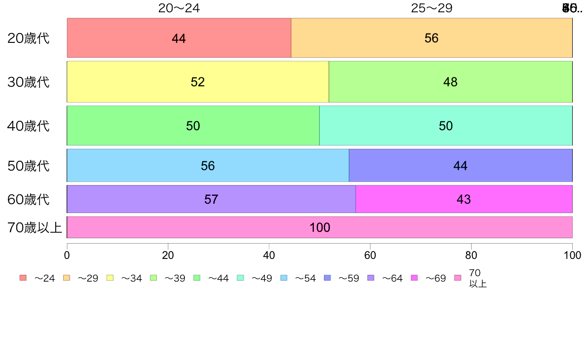 | 20 〜 24 | 25 〜 29 | 30 〜 34 | 35 〜 39 | 40 〜 44 | 45 〜 49 | 50 〜 54 | 55 〜 59 | 60 〜 64 | 65 〜 69 | 70 以上 | 計 |