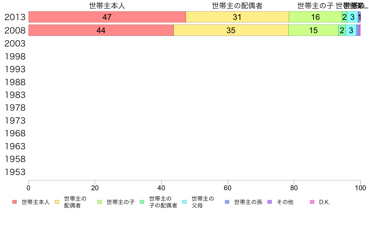 | | 問 | 世帯主本人 | 世帯主の配偶者 | 世帯主の子 | 世帯主の子の配偶者 | 世帯主の父母 | 世帯主の孫 | その他 | D. K. | 計 |
