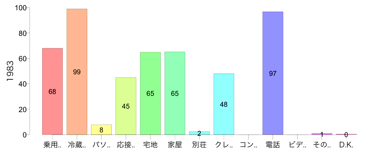| 1 | 乗用車(営業用以外) | | 2 | 冷蔵庫 | | 3 | パソコン(マイコン) | | 4 | 応接セット | | 5 | 宅 地 | | 6 | 家屋(分譲マンションを含む) | | 7 | 別荘(共同所有を含む) | | 8 | クレジットカード | | 9 | コンパクト・ディスク | | 10 | 電 話 | | 11 | ビデオ・レコーダ | | 12 | その他[記入] | 13 D.K. |