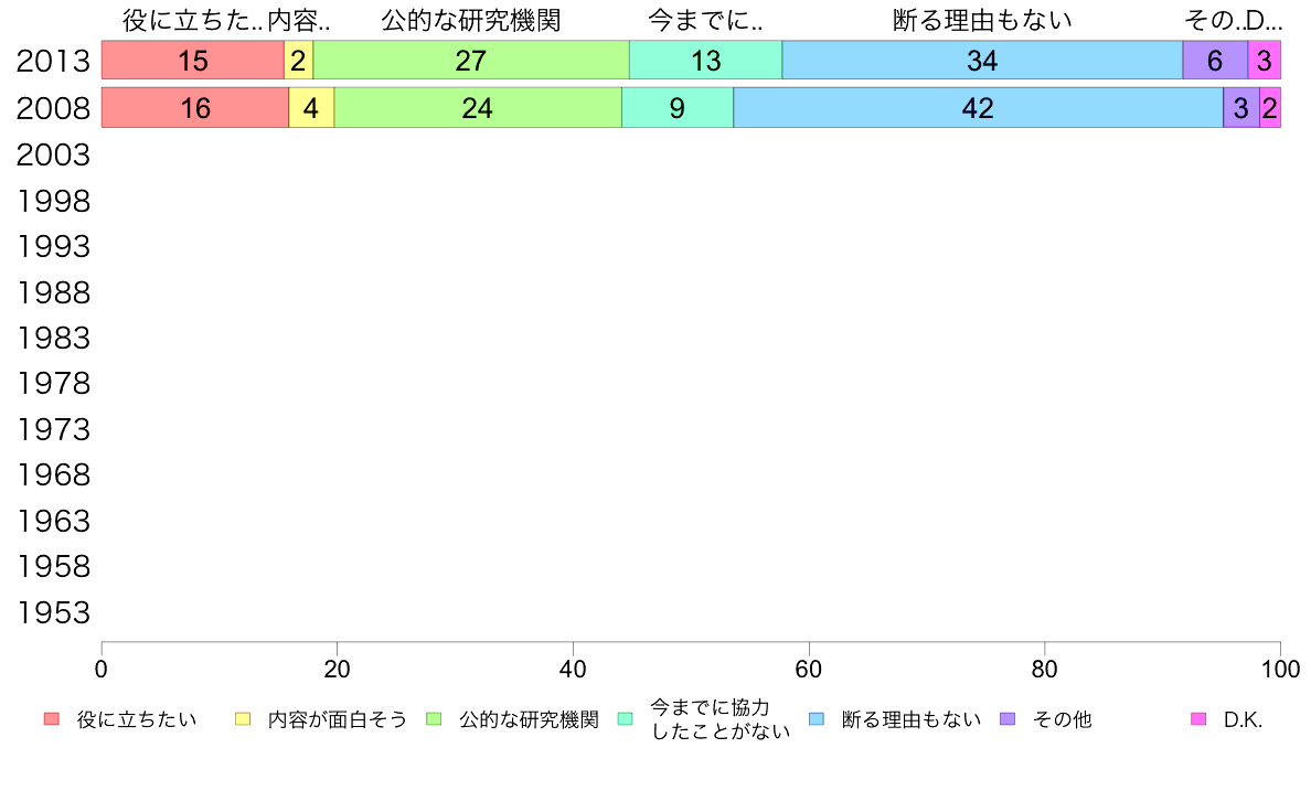 | 1 | 役に立ちたいと思ったから | | 2 | 内容が面白そうだと思ったから | | 3 | 公的な研究機関が行う調査だから | | 4 | 今までに、こういう調査に協力したことがほとんどなかったから | | 5 | 特に断る理由もなかったから | | 6 | その他[記入] | 7 D.K. |