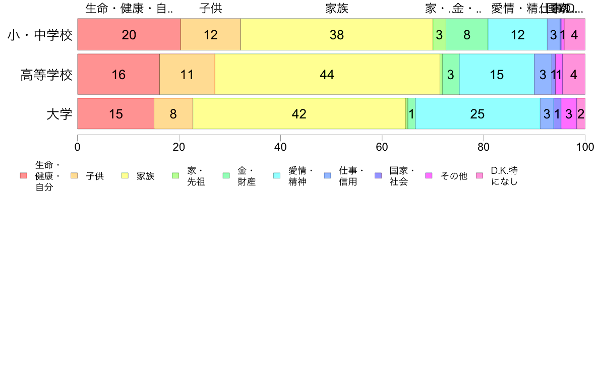 | 生命・健康・自分 | 子供 | 家族 | 家・先祖 | 金・財産 | 愛情・精神 | 仕事・信用 | 国家・社会 | その他 | D. K.特になし | 計 |