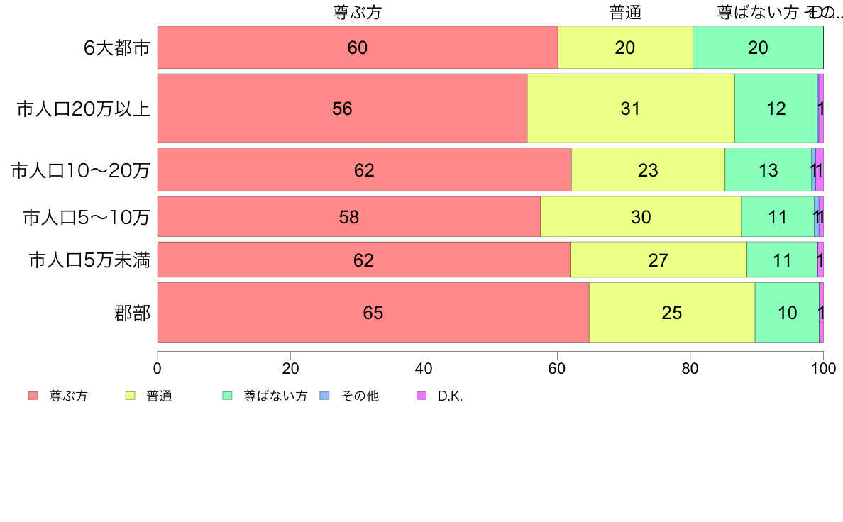 | 6大都市 | 60 | 20 | 20 | - | - | 100 | ( 163) | | 市人口20万以上 | 56 | 31 | 12 | 0 | 1 | 100 | ( 427) | | 市人口10〜20万 | 62 | 23 | 13 | 1 | 1 | 100 | ( 169) | | 市人口5〜10万 | 58 | 30 | 11 | 1 | 1 | 101 | ( 146) | | 市人口5万未満 | 62 | 27 | 11 | - | 1 | 101 | ( 113) | | 郡部 | 65 | 25 | 10 | - | 1 | 101 | ( 321) | | 北海道 | 57 | 25 | 16 | - | 2 | 100 | ( 61) | | 東北 | 62 | 25 | 12 | 1 | 1 | 101 | ( 112) | | 関東 | 56 | 27 | 17 | - | - | 100 | ( 367) | | 中部 (東) | 52 | 36 | 11 | - | - | 99 | ( 107) | | 中部 (西) | 63 | 26 | 10 | 1 | - | 100 | ( 127) | | 近畿 | 65 | 21 | 11 | - | 2 | 99 | ( 233) | | 中国 | 67 | 22 | 11 | - | - | 100 | ( 103) | | 四国 | 54 | 33 | 11 | - | 2 | 100 | ( 54) | | 九州 | 60 | 31 | 8 | 1 | 1 | 101 | ( 175) | | 小・中学校 | 75 | 19 | 5 | - | 1 | 100 | ( 371) | | 高等学校 | 57 | 29 | 14 | 0 | 1 | 101 | ( 606) | | 大学 | 48 | 33 | 17 | 0 | 1 | 99 | ( 347) |