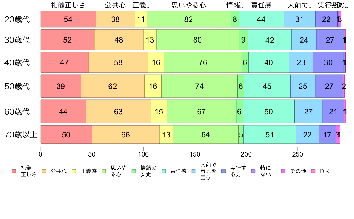 〔リスト〕子供がいるとしたら、あなたは、将来、どのような性質を持つ大人になってほしいと思いますか。つぎの中から、特に重要と思うものを3つ選んでください?(M.A.)