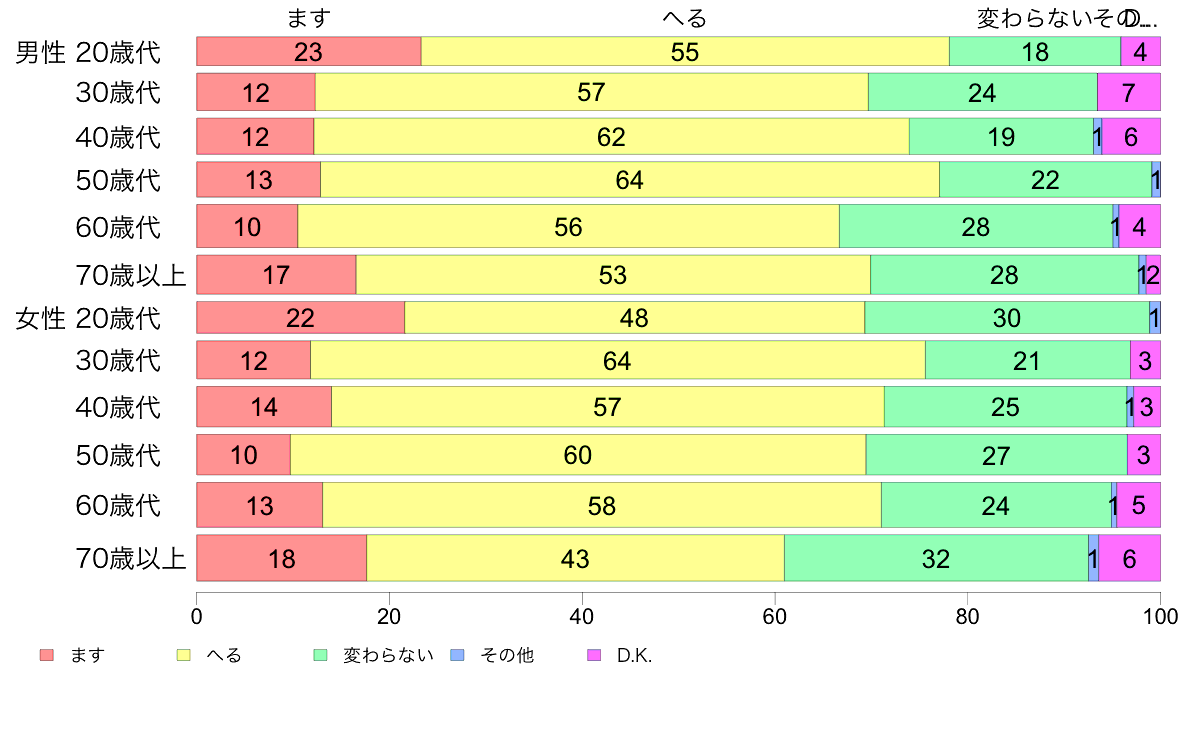 b)では、心のやすらかさは、ますと思いますか、へると思いますか?