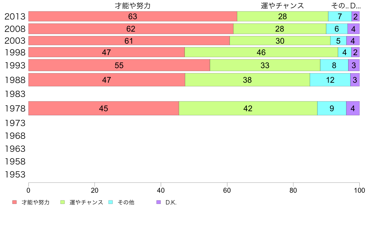 いまの社会で成功している人をみて、その人の成功には、個人の才能や努力と、運やチャンスのどちらが大きな役割をはたしていると思いますか?