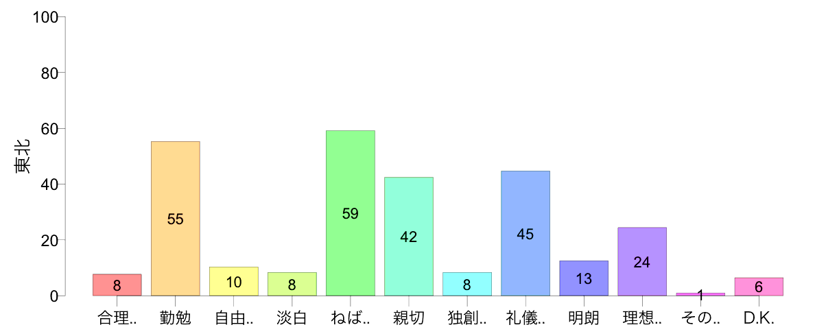 | 合理的 | 勤勉 | 自由を尊ぶ | 淡白 | ねばり強い | 親切 | 独創性にとむ | 礼儀正しい | 明朗 | 理想を求める | その他 | D. K. | 計 【複数回答】 |