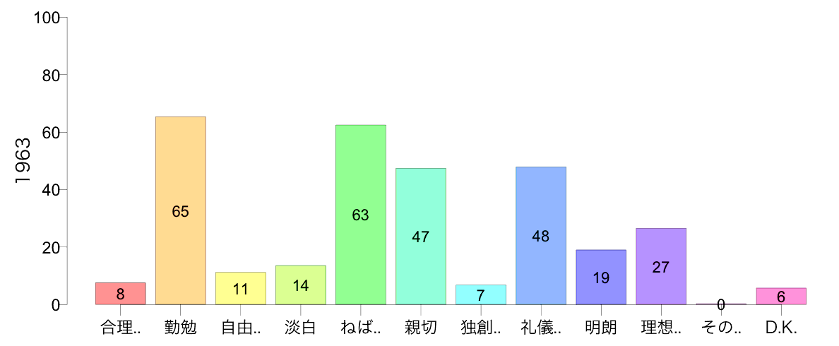 | 1 | 合理的 | | 2 | 勤 勉 | | 3 | 自由を尊ぶ | | 4 | 淡 白 | | 5 | ねばり強い | | 6 | 親 切 | | 7 | 独創性にとむ | | 8 | 礼儀正しい | | 9 | 明 朗 | | 10 | 理想を求める | | 11 | その他[記入] | 12 D.K. |