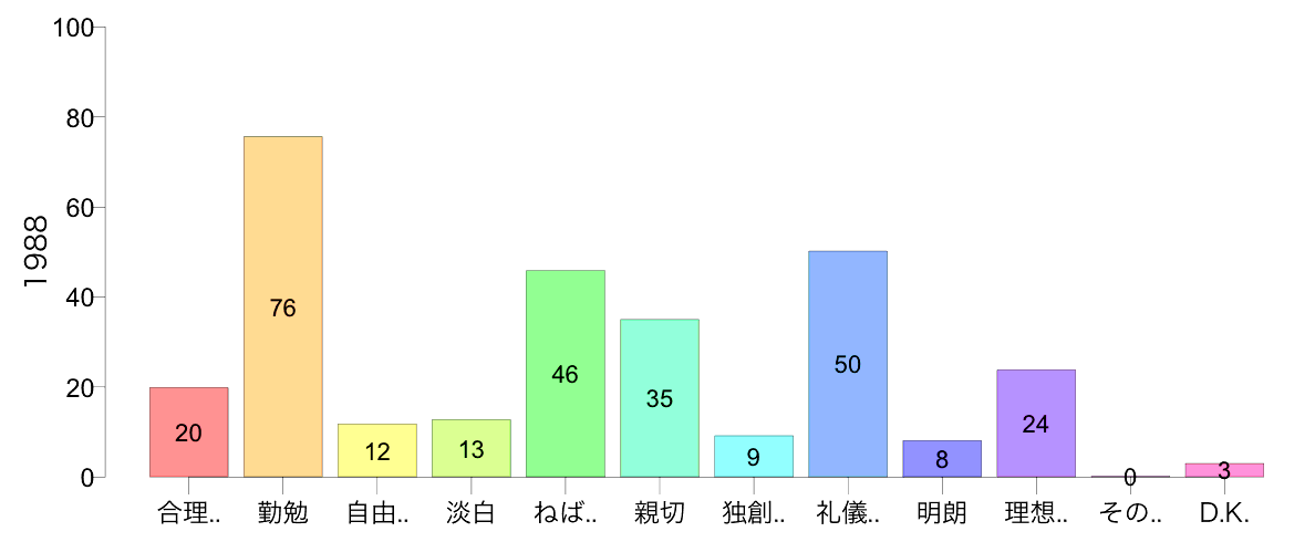 | 1 | 合理的 | | 2 | 勤 勉 | | 3 | 自由を尊ぶ | | 4 | 淡 白 | | 5 | ねばり強い | | 6 | 親 切 | | 7 | 独創性にとむ | | 8 | 礼儀正しい | | 9 | 明 朗 | | 10 | 理想を求める | | 11 | その他[記入] | 12 D.K. |